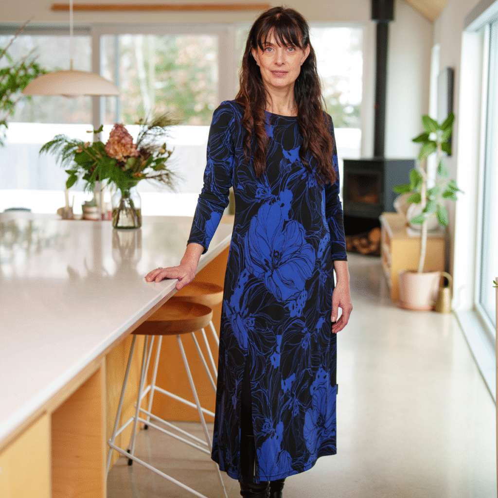 Si vous aimez les classiques teintés d’audace, la robe ⅞ Fundy est pour vous. Son motif floral pervenche sur fond noir donne un punch visuel magnifique, tout en restant parfaitement dans l'esprit des Fêtes. Sa coupe semi-ajustée flatteuse est agrémentée d’une fente sur la jambe droite, ajoutant une touche d’élégance. Dans cette robe, vous serez confortable pour célébrer en beauté, toute la nuit du réveillon! Peu importe votre grandeur, elle tombe toujours juste, sans retouches. Pour moi, c’est la robe qui allie le chic au confort pour les femmes qui savent porter avec assurance des pièces uniques comme celle-ci.