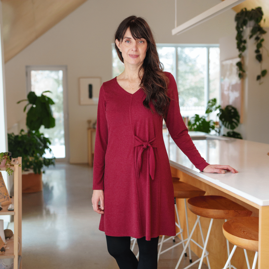 Il y a des robes qui nous donnent envie de prendre le temps de nous sentir belles. La robe épilobe en est une. Sa coupe cache-cœur tient parfaitement en place, même quand on se penche pour attraper un cadeau sous le sapin ou qu’on rit un peu trop fort en jouant à un jeu de société (c’est le jeu Tabou qui traverse les années, dans ma famille!). Elle souligne la taille avec délicatesse et offre juste ce qu’il faut d’ouverture au décolleté pour se sentir élégante, sans choquer la parenté. Son tissu léger et infroissable est un vrai cadeau en soi… On peut la porter toute la journée du 24, entre farce et emballage de dernière minute, sans avoir à se changer pour la réception du réveillon.