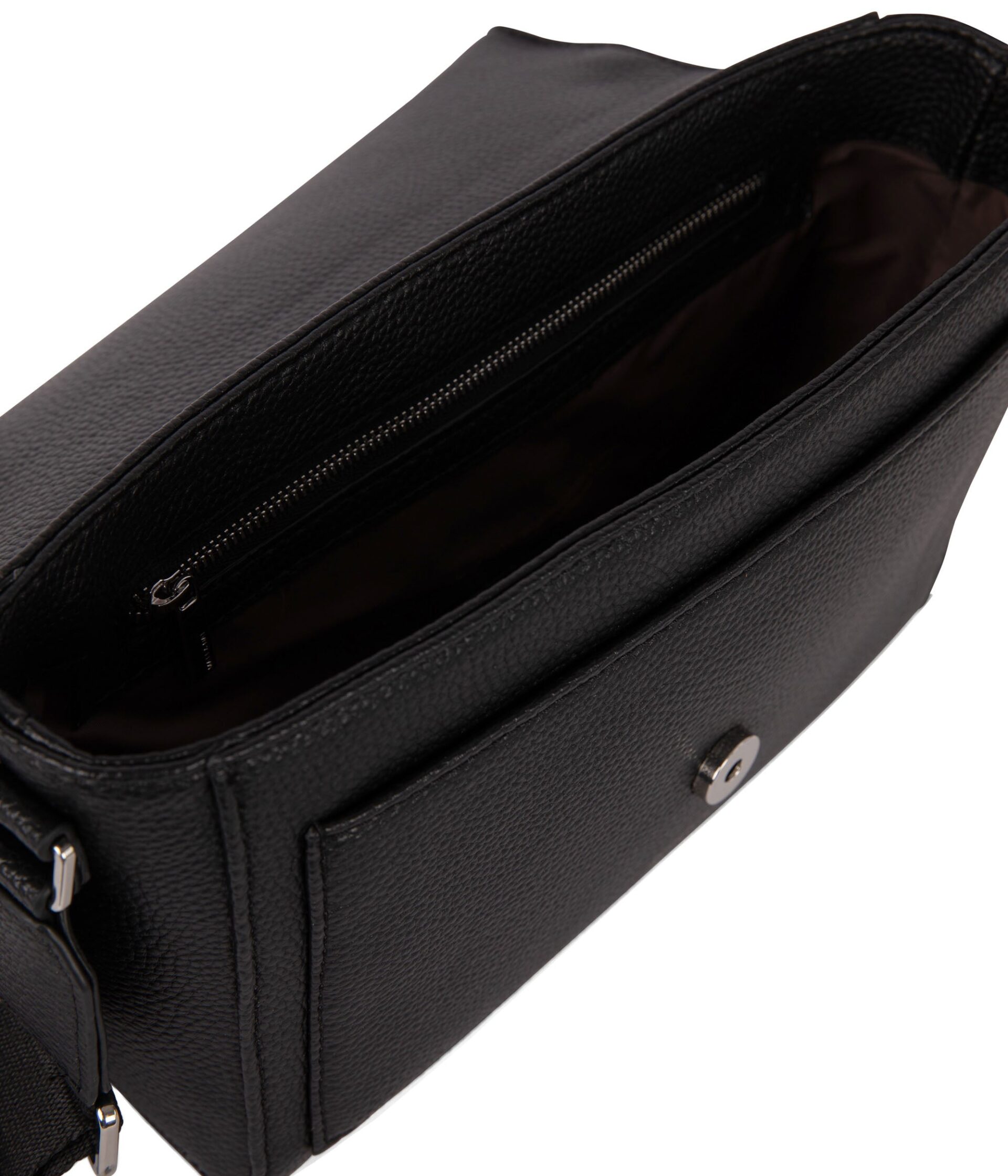Une sacoche avec fermeture à rabat et une sangle ajustable qui peut être raccourcie pour porter comme un sac d’épaule, une poche ouverte en avant, et une grande poche intérieure zippée.