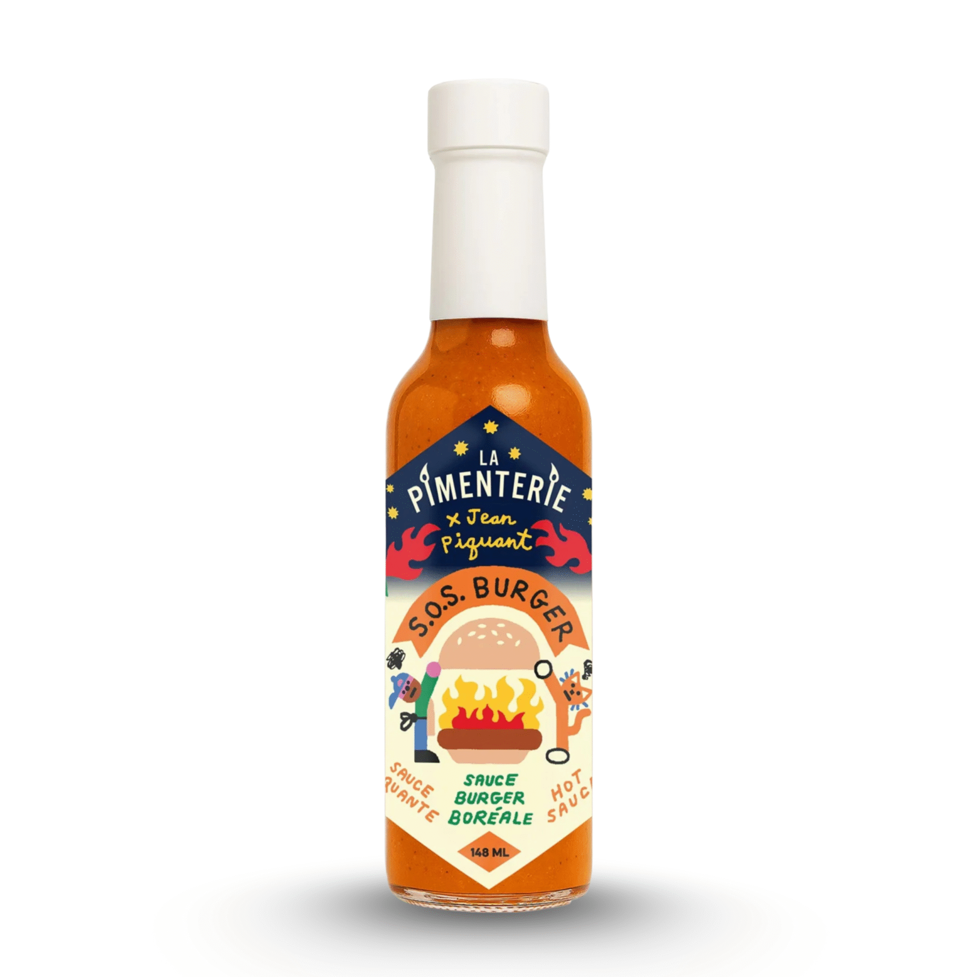 Sauce piquante issue d'une collaboration entre La pimenterie et Jean-Piquant. SOS Burger. Une sauce piquante à burger punché aux Pousses d’Épinette, Myrique Baumier et un peu de Sirop d'Érable. (Ce n'est pas merveilleux ça là!) Relevée au Habanero. Sucrée au sirop d’érable. Conçu pour rehausser tes burgers.