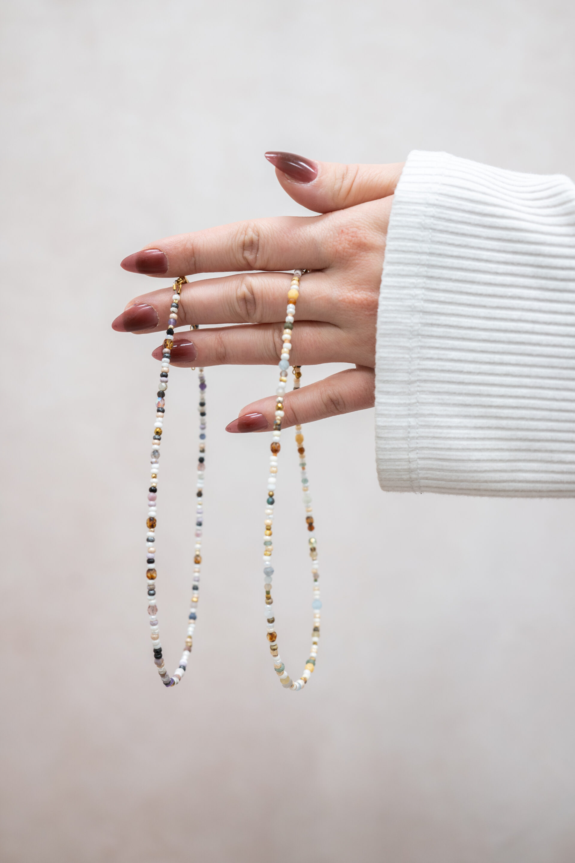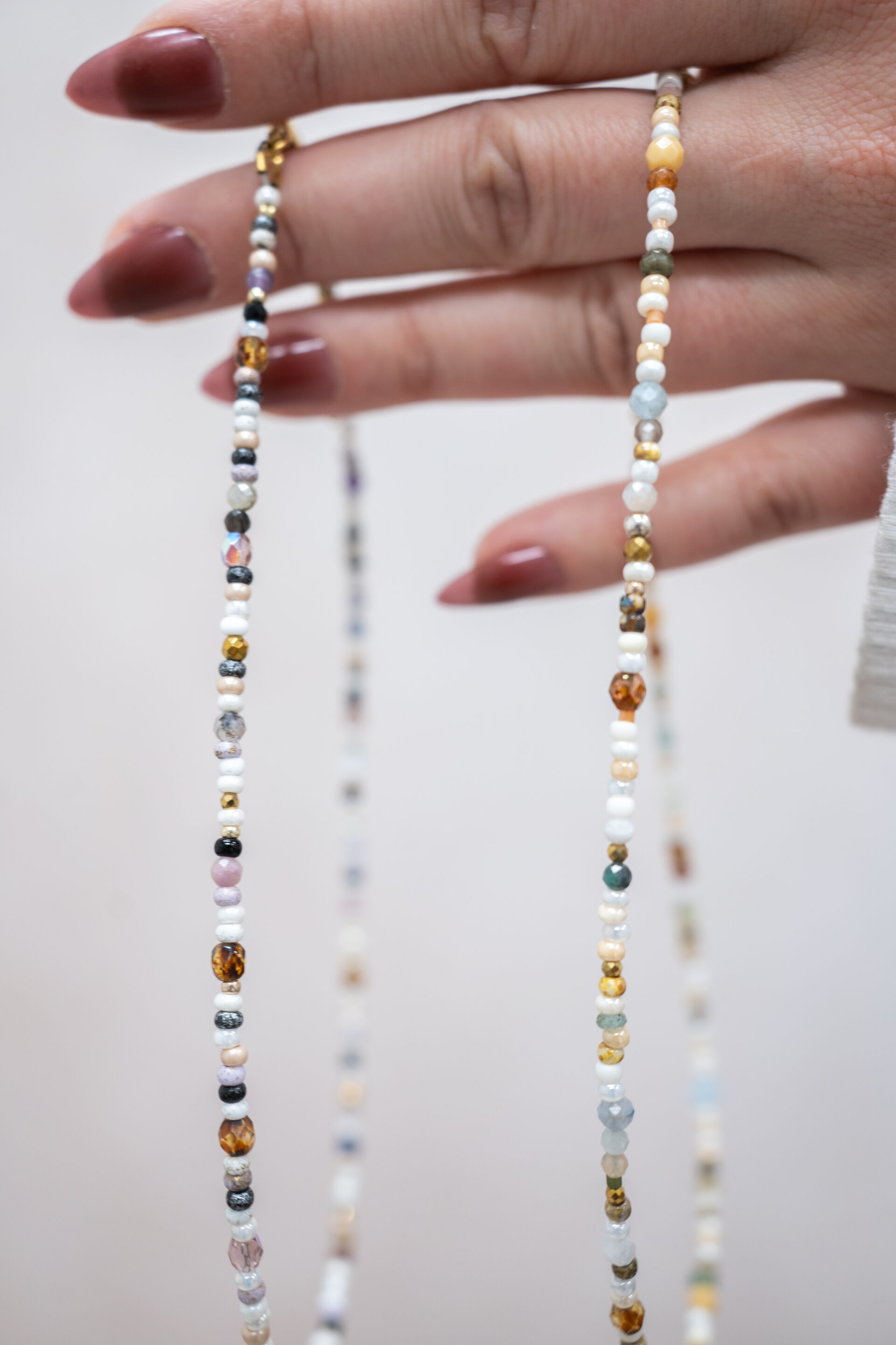 Voici un délicat collier fait de perles de verre de différentes grosseurs et couleurs. Il est résistant à l'eau et hypoallergène, parfait pour les peaux sensibles.