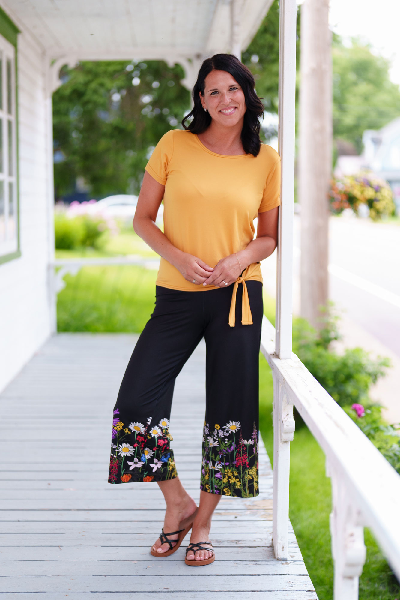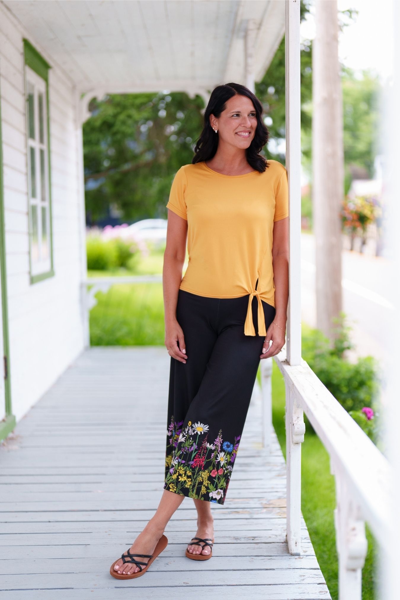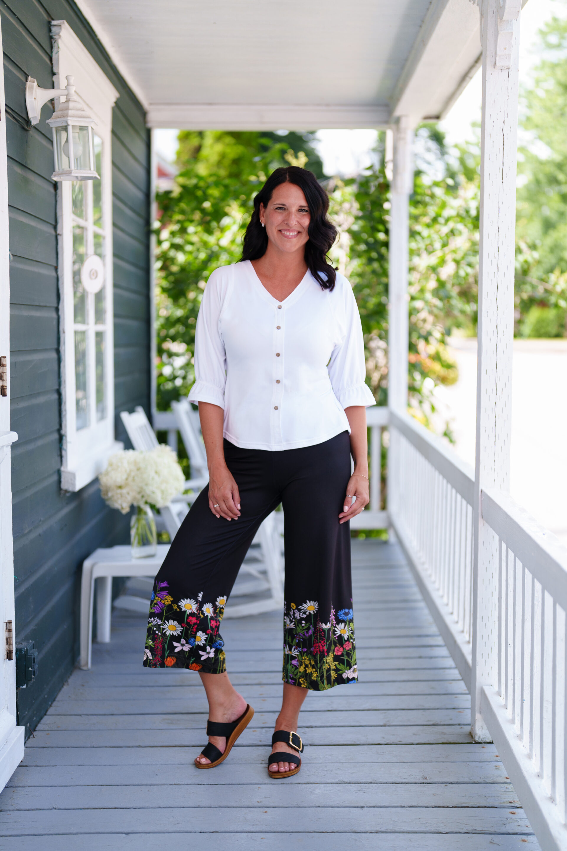 Porter le gaucho 7/8 amaretto, c’est tout comme se promener dans un champ de fleurs sauvages. Pantalon noir léger au bas fleuri, il traverse avec vous l’été dans un air zen et heureux. Son doux tissu extensible est imprimé à 15 minutes de notre atelier-boutique de St-Sévère, dans une campagne où les champs en fleurs dansent avec le vent.
