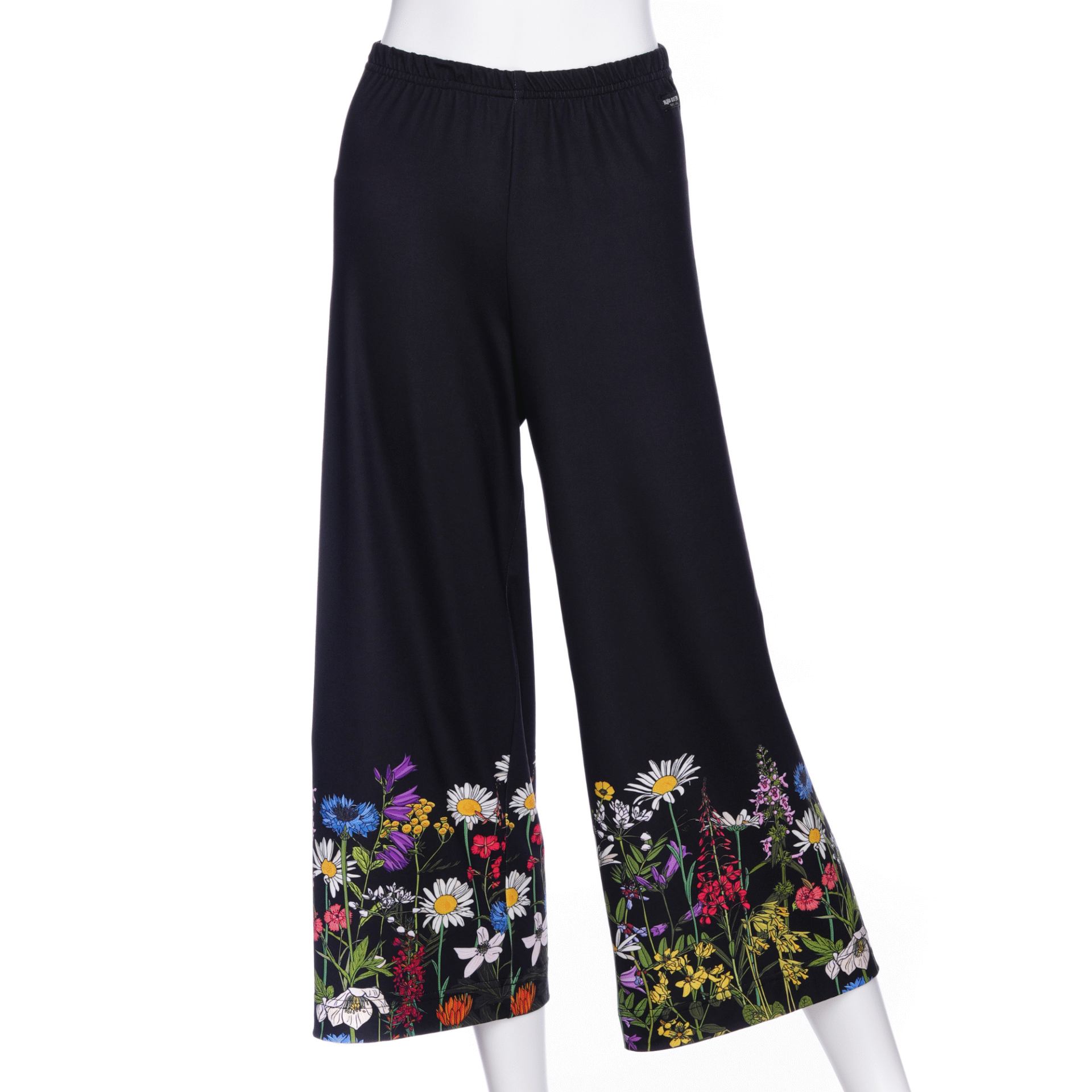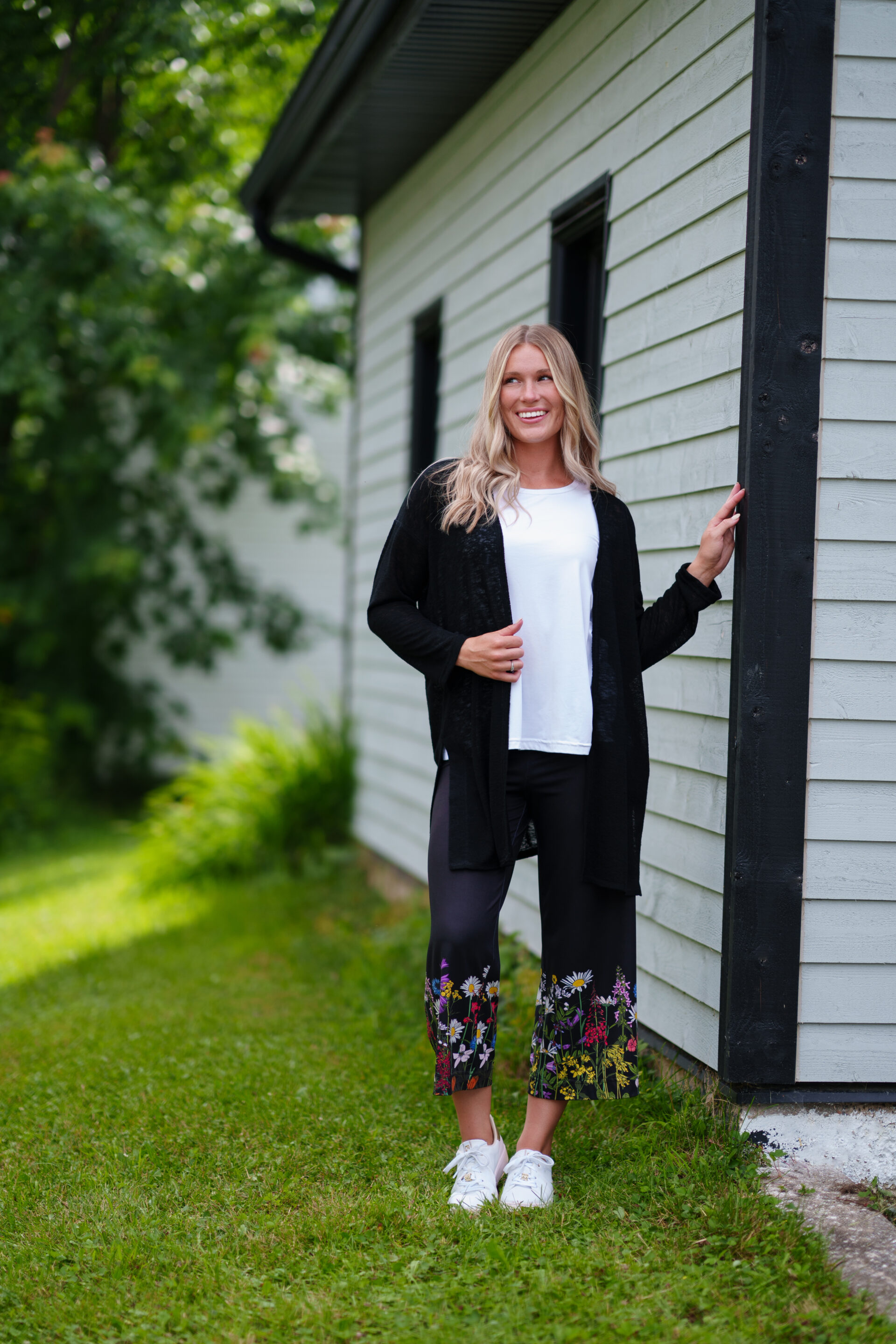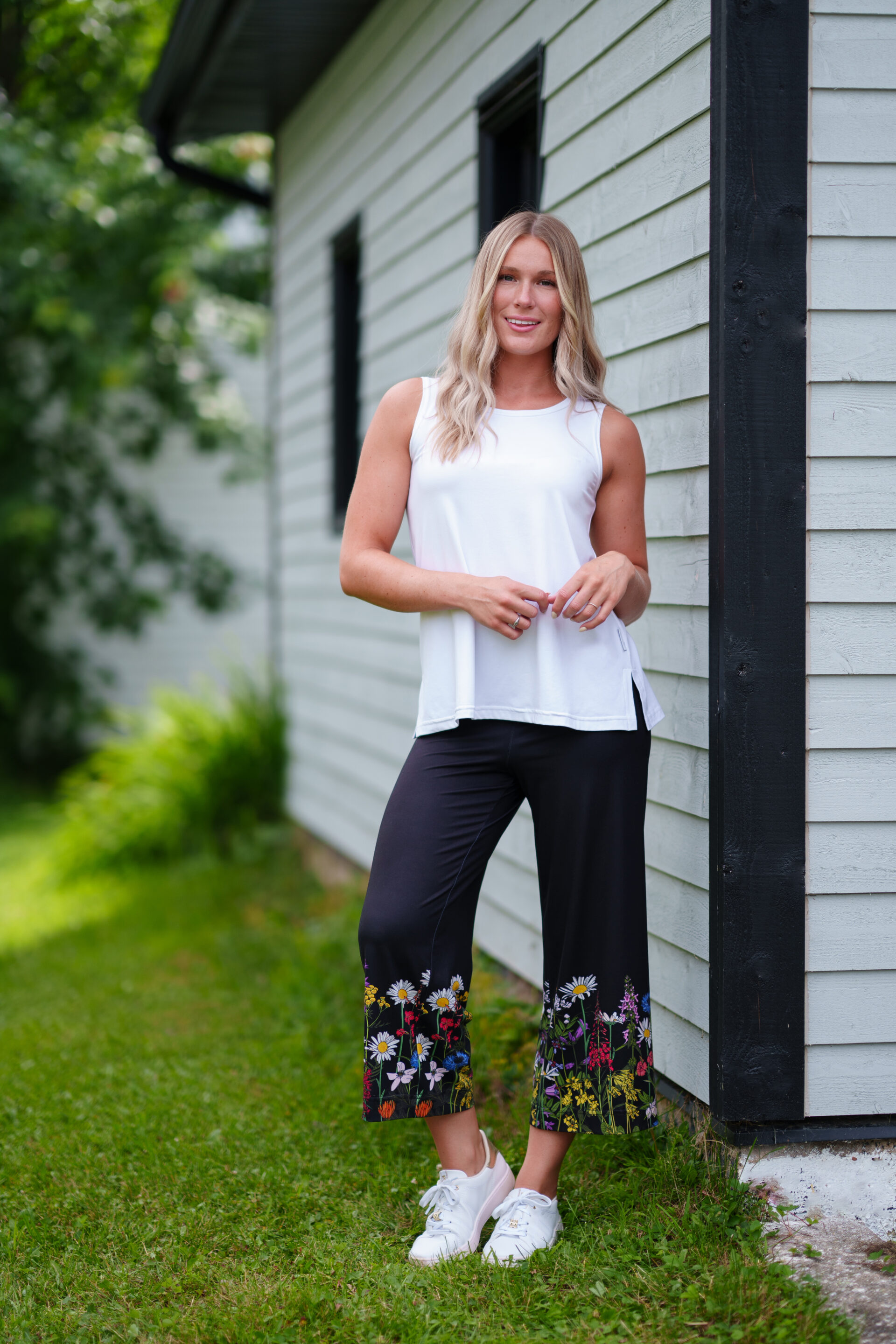 Porter le gaucho 7/8 amaretto, c’est tout comme se promener dans un champ de fleurs sauvages. Pantalon noir léger au bas fleuri, il traverse avec vous l’été dans un air zen et heureux. Son doux tissu extensible est imprimé à 15 minutes de notre atelier-boutique de St-Sévère, dans une campagne où les champs en fleurs dansent avec le vent.