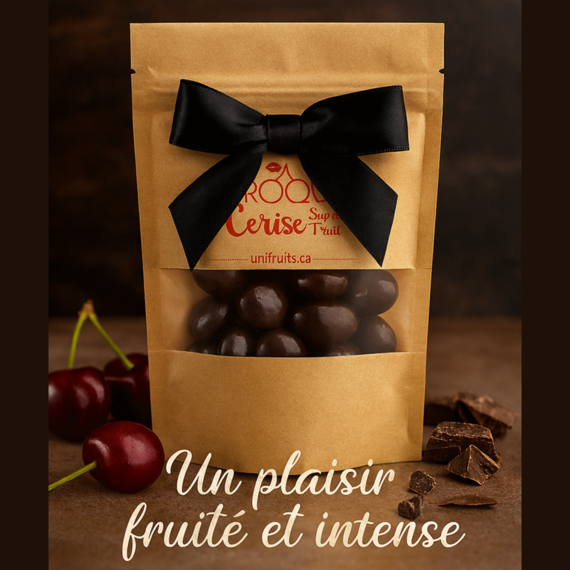 Une cerise sèche et sucrée enrobée par l’amertume d’un chocolat noir à 72 % de cacao, voilà qui saura charmer les amateurs comme les connaisseurs. Fait au Québec par Croque cerise. Veuillez prendre note que l'emballage pourrait différer de la photo mais à l'intérieur, ça sera le même délicieux produit!