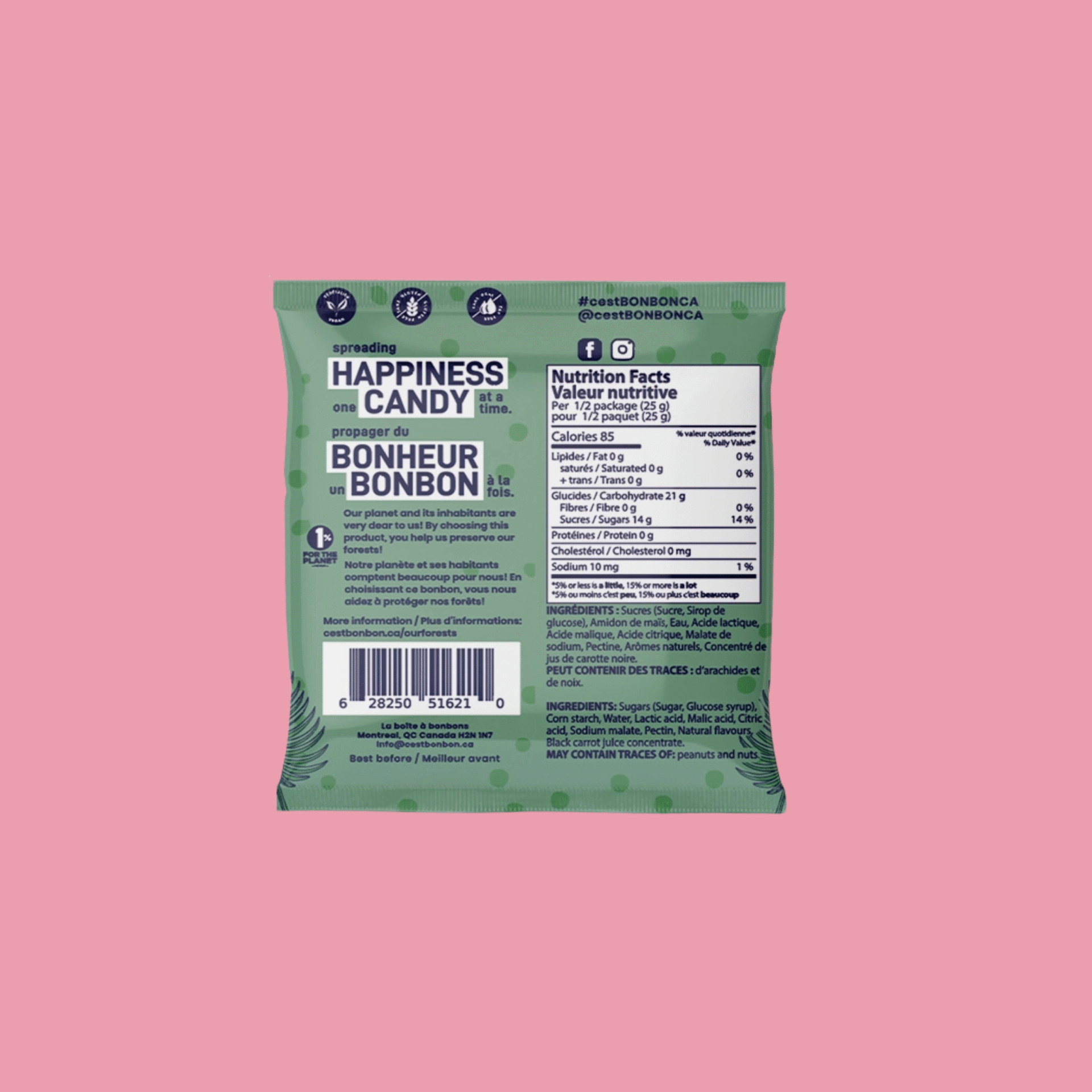 Fait au Québec par La boîte à bonbons, dont la mission est de propager du bonheur, un bonbon à la fois! Du véritable bonheur en sac!
