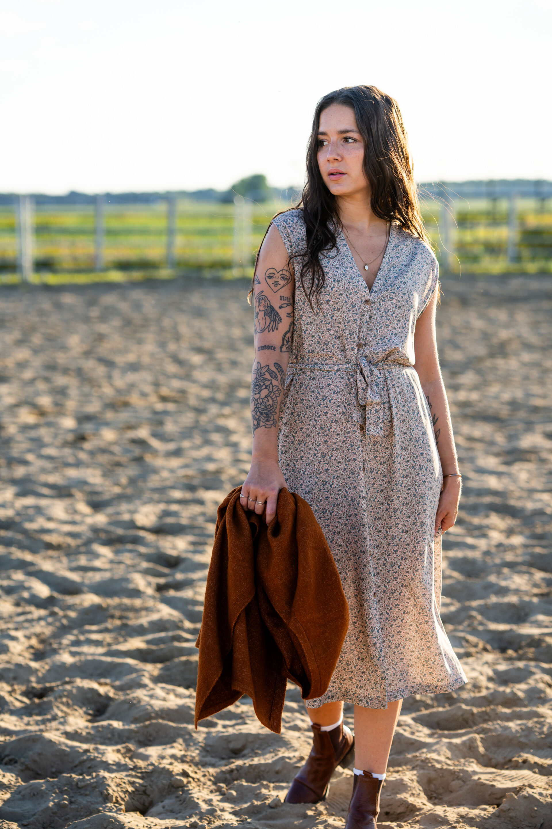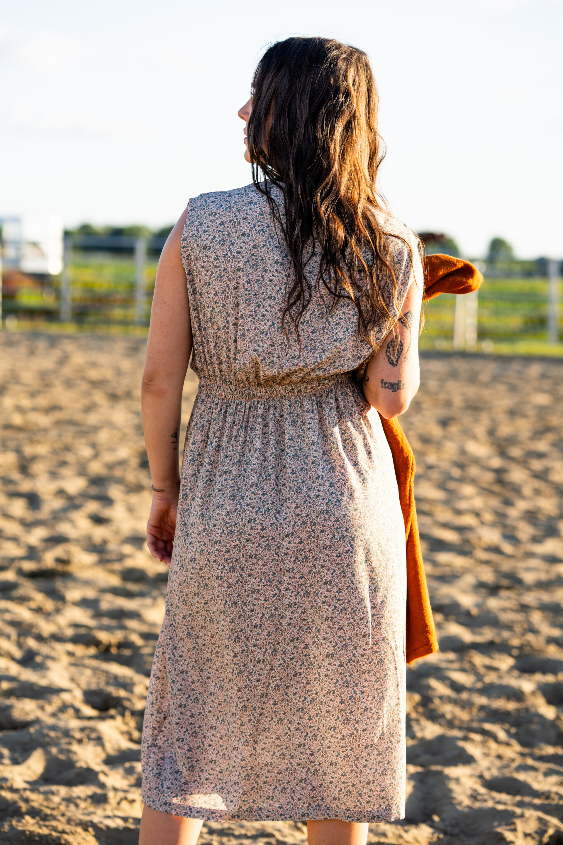 Sa taille est soulignée par une ceinture ajustable à l’avant et un élastique discret à l’arrière, pour un confort optimal et une coupe flatteuse. Le haut gagne en volume tandis que la jupe, longueur mi-mollet, reste sobre et élégante.