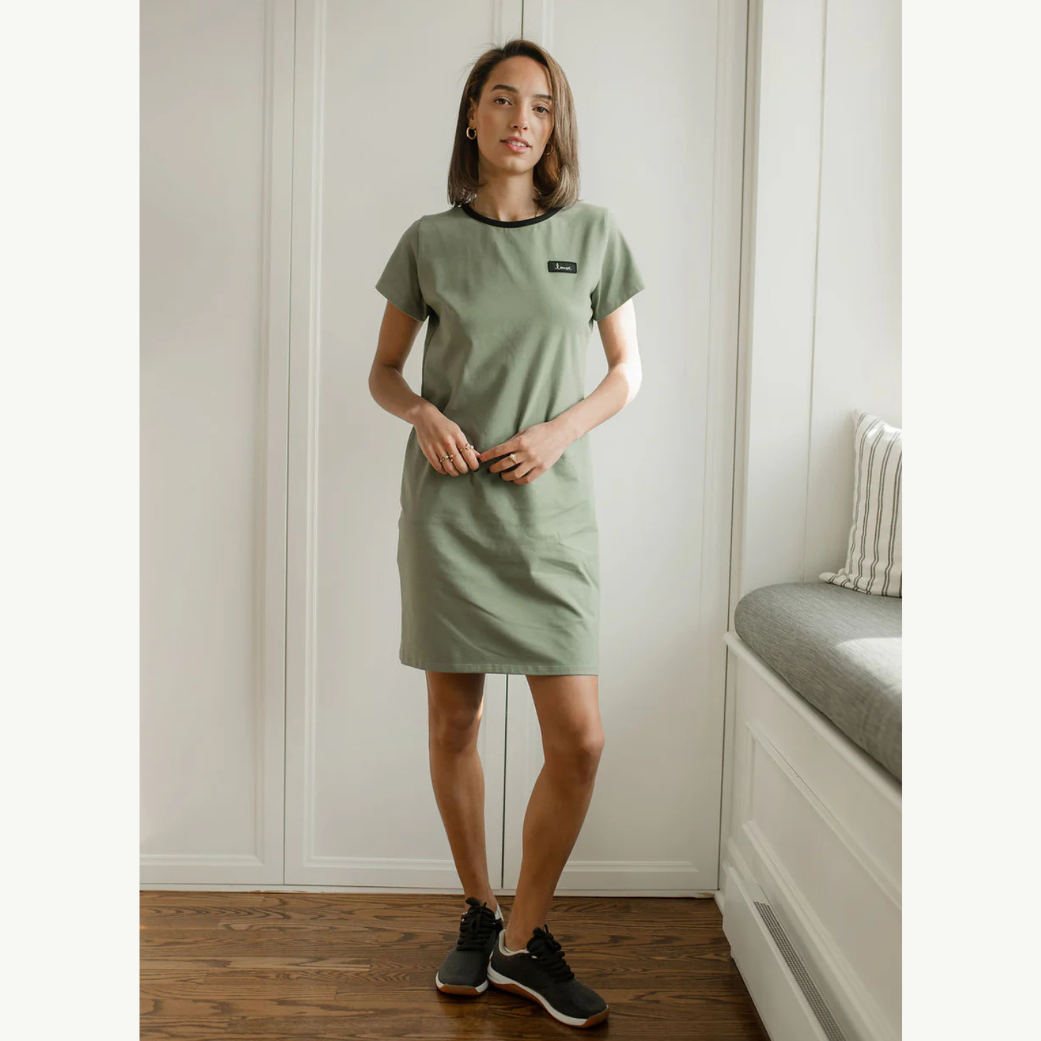 Avec sa coupe droite (ni trop ajustée, ni trop ample), sa longueur mi-cuisse et ses manches courtes, elle offre un parfait équilibre entre confort et style sans effort. Le col en rib noir apporte une finition nette, tandis que l’écusson Louve brodé au cœur ajoute une touche subtile et distinctive.