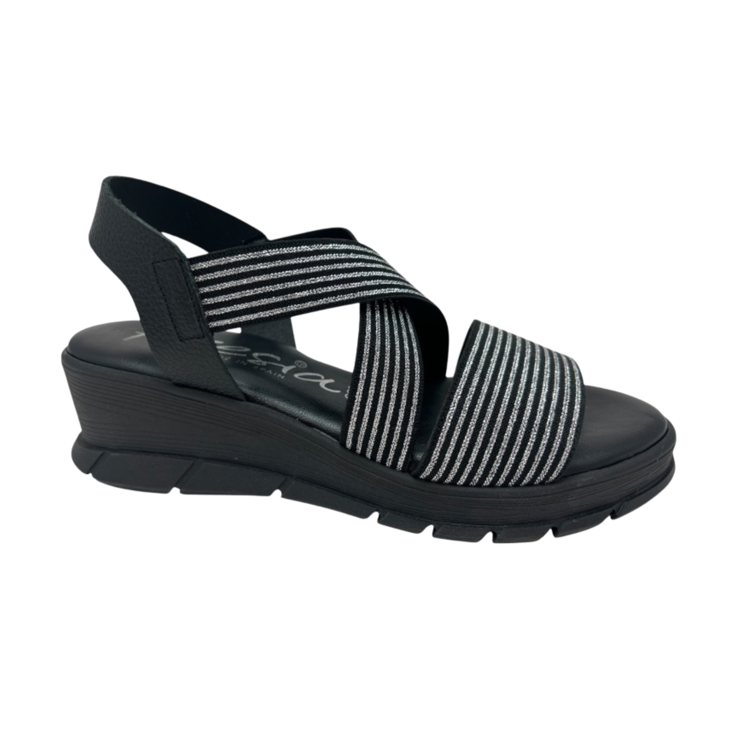 Faites briller vos pas avec cette sandale au look audacieux. Les brides élastiques noires, rehaussées de rayures argentées scintillantes, captent la lumière à chaque mouvement. La semelle épaisse et crantée apporte une assise stable et confortable, parfaite pour arpenter la ville ou flâner en toute décontraction. Chic, pratique et légèrement étincelante.