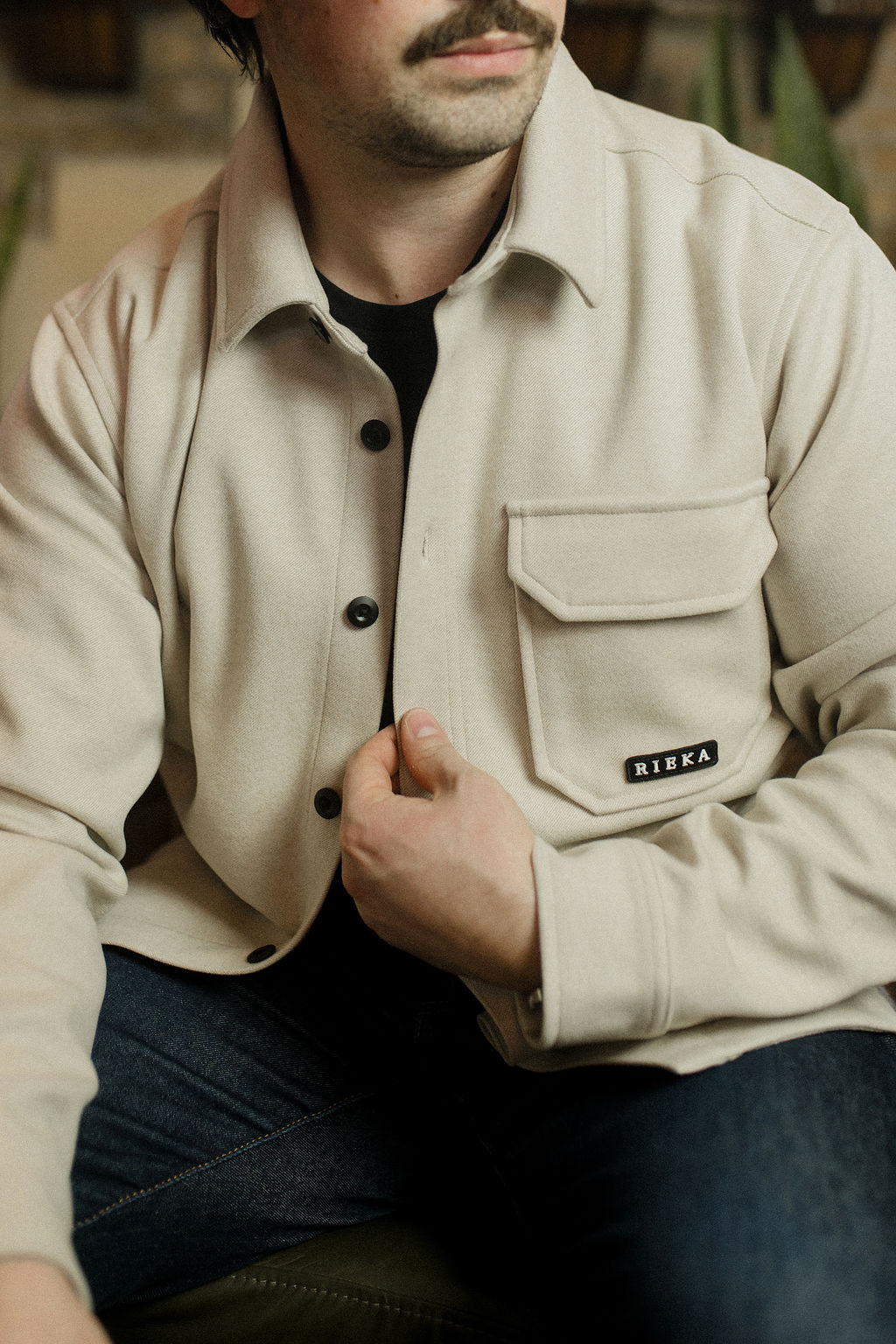 Sa coupe structurée et légèrement ample offre une grande liberté de mouvement, tout en conservant une silhouette soignée. Les poches poitrine ajoutent une touche utilitaire tendance, tandis que sa teinte neutre en fait un essentiel facile à agencer.